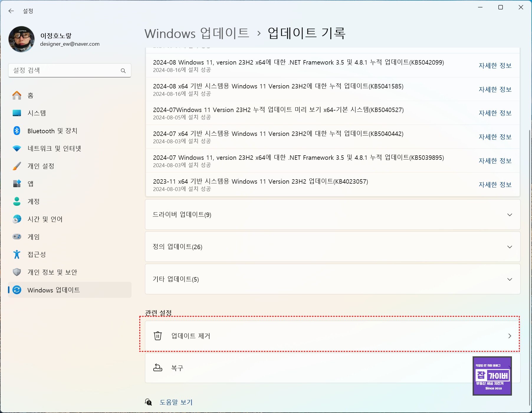 - 설정 > Windows 업데이트 > 업데이트 기록 > 업데이트 제거로 이동한 후, KB5043145 패치를 찾아 제거 버튼을 클릭하면 된다.