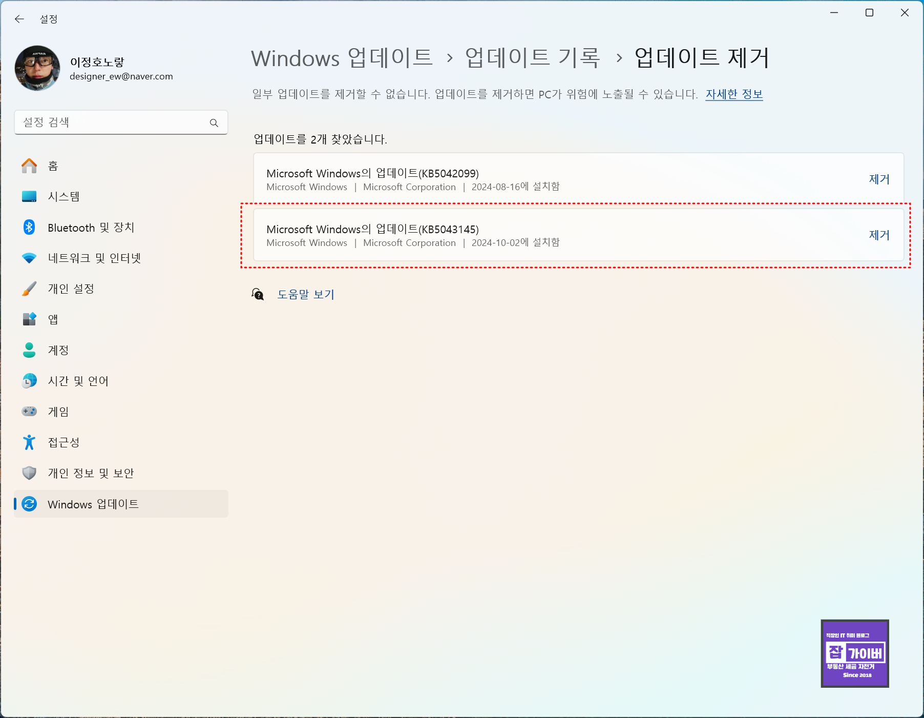 - 설정 > Windows 업데이트 > 업데이트 기록 > 업데이트 제거로 이동한 후, KB5043145 패치를 찾아 제거 버튼을 클릭하면 된다.