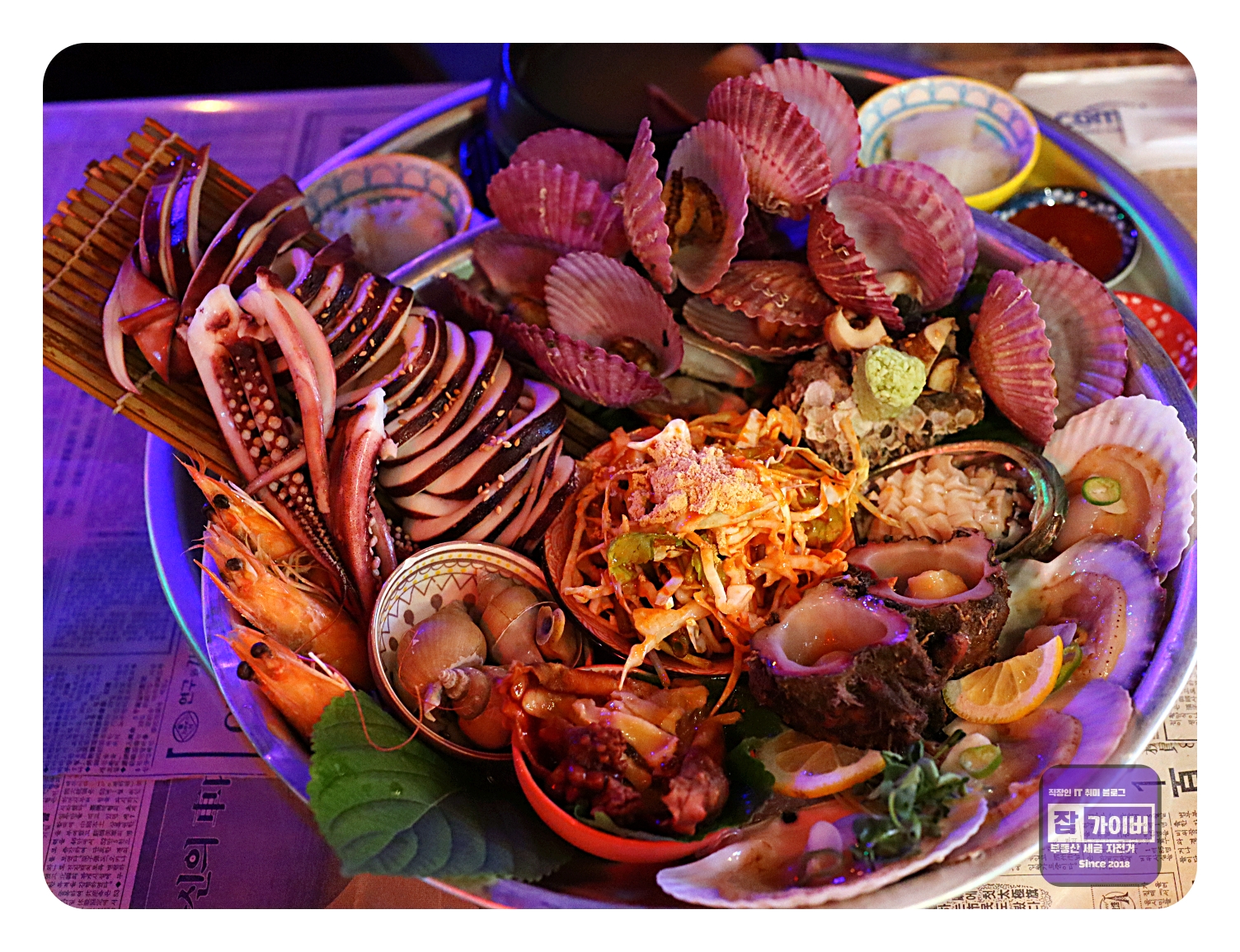 발산역 횟집 너울의 해물 한 상은 가리비, 전복, 멍게, 소라, 자숙 새우 등 다양한 해산물이 차려진 플래터로, 바다의 신선함을 한 자리에서 느낄 수 있었습니다.