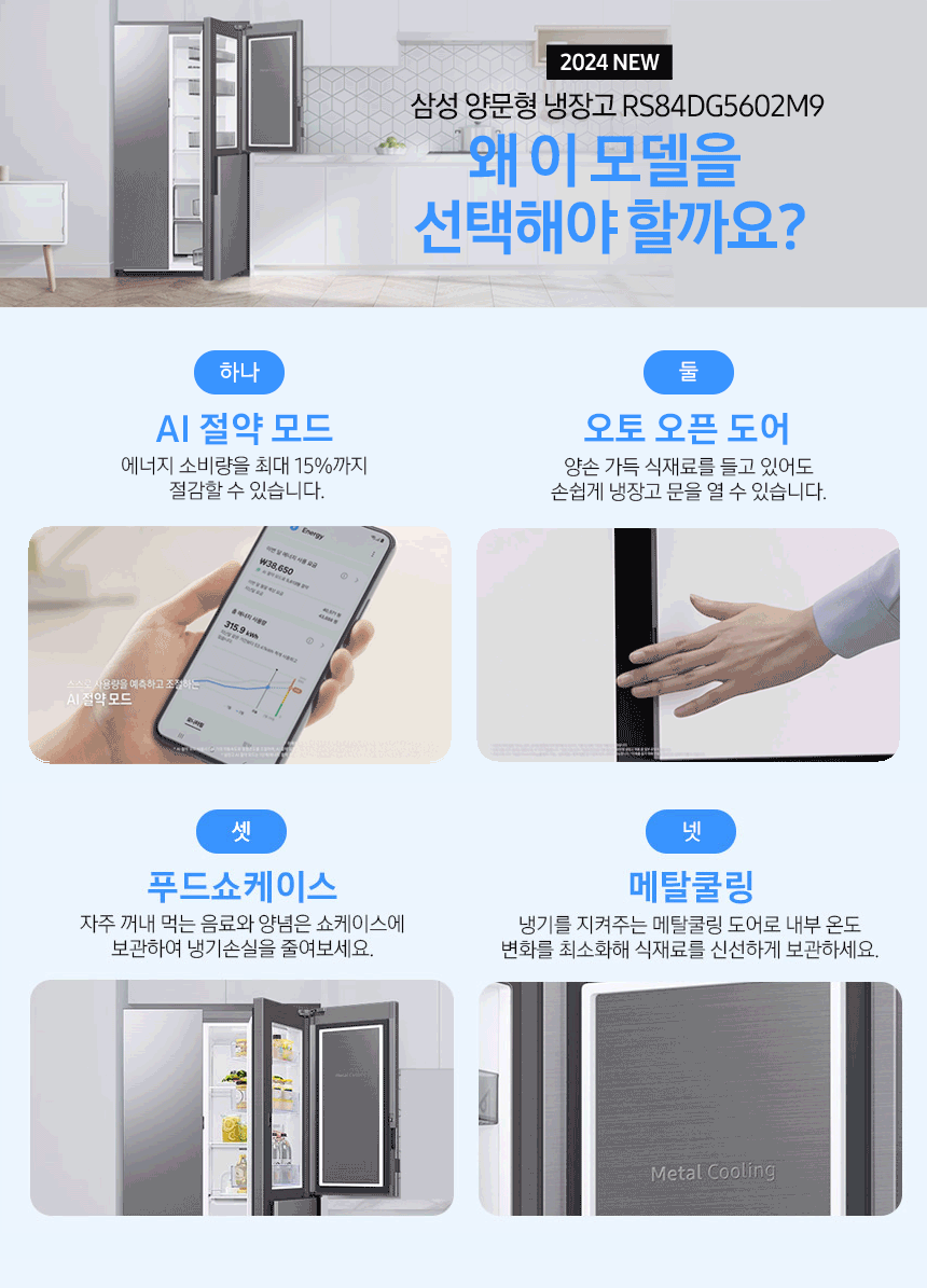 RS84DG5202B4 846 526/320 2등급 AI 절약모드, 스마트싱스, WiFi, 메탈쿨링도어, 오토오픈도어 메탈