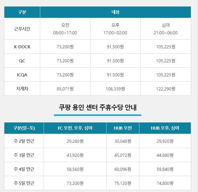 쿠팡 물류센터 일용직 급여 일당 및 공휴일 수당정리