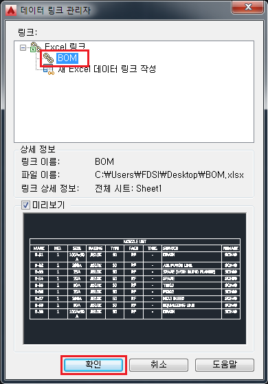 데이터 링크 관리자 창에 선택한 Excel 파일의 이름이 나타나는 것을 확인하고 확인을 누릅니다.