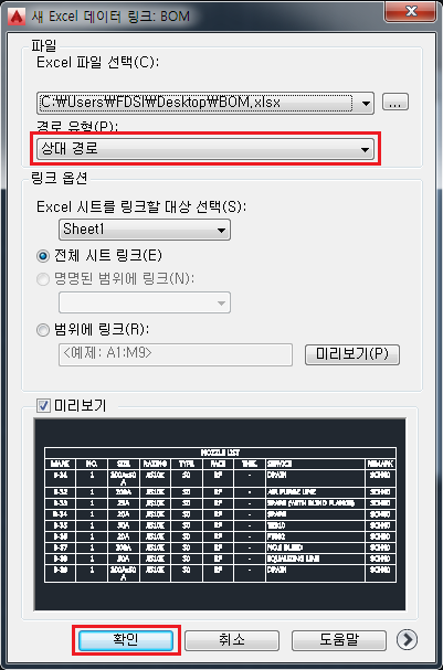 엑셀 표 -> 오토캐드 실시간 연동하여 불러오기 - 데이터링크