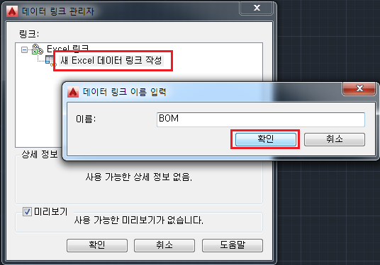 데이터 링크 관리자 창이 열리면 새 Excel 데이터 링크 작성을 선택한 후 원하는 이름을 입력하고 확인을 클릭합니다.