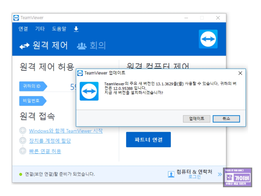팀뷰어 버전 불일치로 인해 원격 접속 오류가 발생할 수 있으므로, 양쪽 장치 모두 최신 버전으로 업데이트한 후 다시 시도해야 합니다.