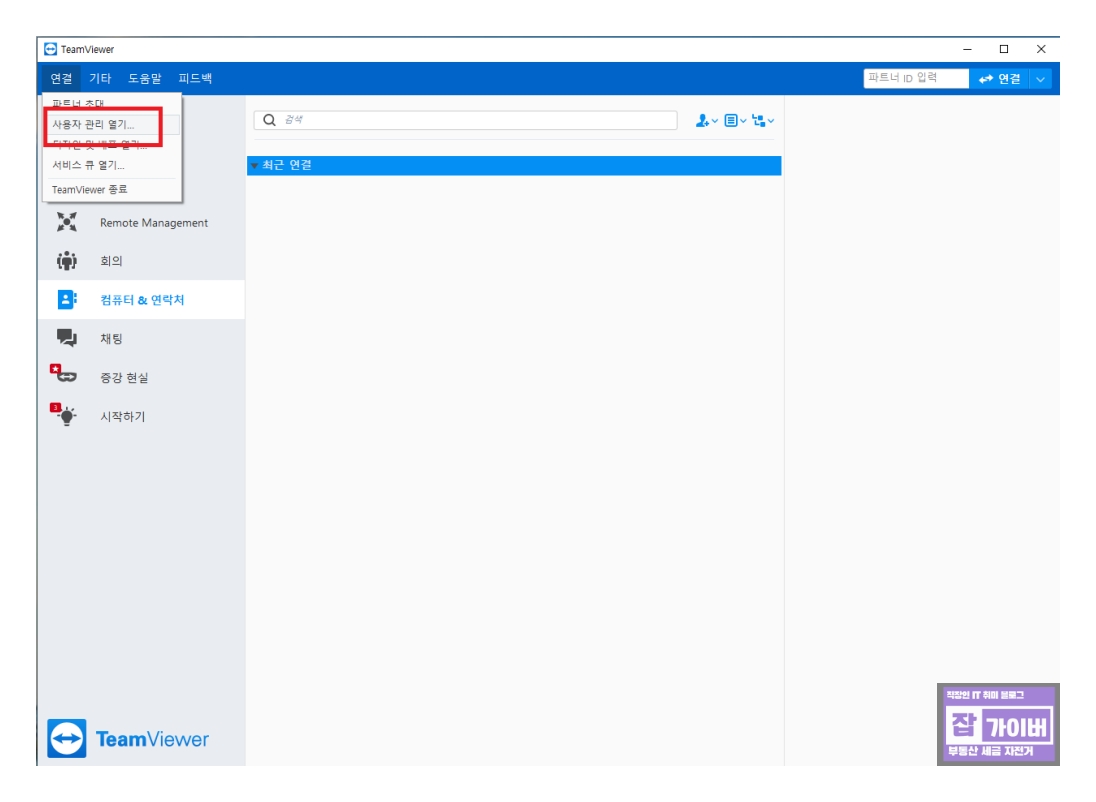 - 팀뷰어 클라이언트 상단의 "연결" 메뉴에서 "사용자 관리 열기"를 클릭합니다.