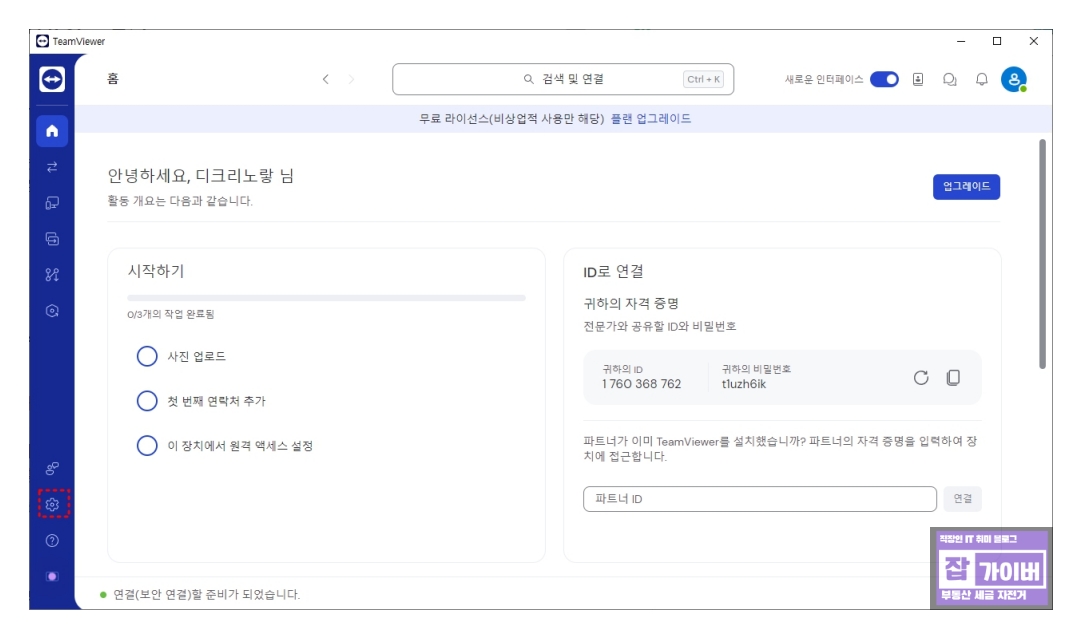 모든 설정을 완료한 후 팀뷰어를 다시 실행하여 원격 접속을 시도합니다.