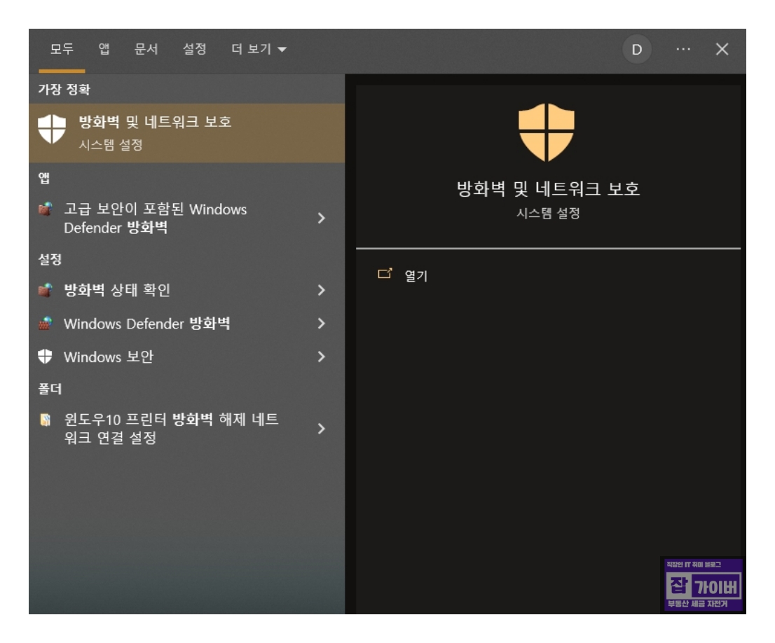 윈도우의 제어판에서 Windows Defender 방화벽을 선택하거나 시작 메뉴에서 "방화벽"을 검색하여 방화벽 설정을 엽니다.