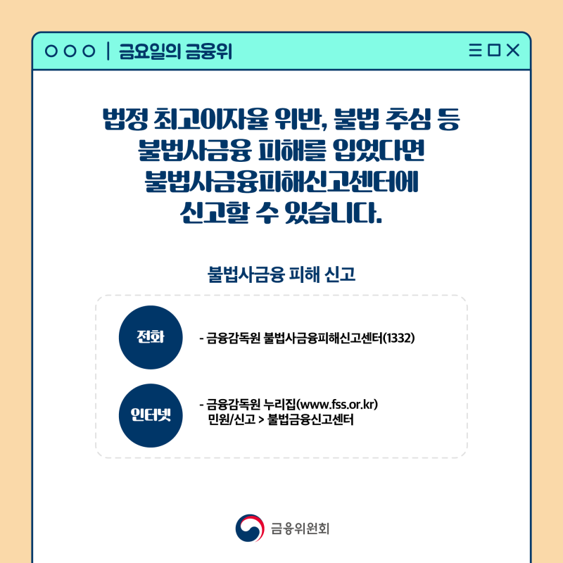 참고: 최고금리를 초과한 불법 대출을 신고하고 지원을 받으려면 금융감독원의 불법사금융 피해신고센터(☎1332)로 문의하거나, 해당 누리집(www.fss.or.kr)을 통해 신고할 수 있습니다..