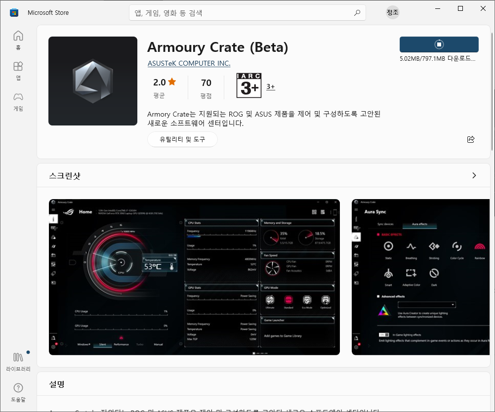 우선 ASUS Armoury Crate는 시스템 모니터링 및 팬, 조명, 쿨링 설정을 제어하는 중요한 소프트웨어입니다.