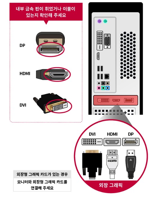 이후 그래픽카드가 외장형일 경우 외장그래픽 포트 연결이 되었는지 확인하고, 입력 설정도 일치하는지 점검하는 것이 우선입니다.