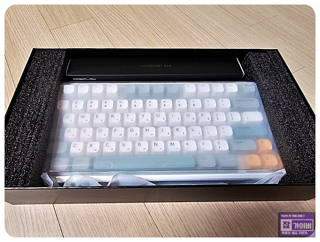 프리플로우 아콘 archon RE:AL HX 풀 알루미늄 기계식 키보드 _스노우 문 블루_violet축 박스를 열었을 때부터 프리플로우의 신경 쓴 포장이 돋보였습니다. 무광의 블랙 박스 위에 깔끔하게 코팅된 RE:AL HX 로고가 고급스러움을 더했고, 내부에는 USB A to C 케이블, 2.4GHz 무선 리시버, 추가 증정 스위치, 키캡 리무버, 설명서 등이 꼼꼼하게 들어 있었습니다.