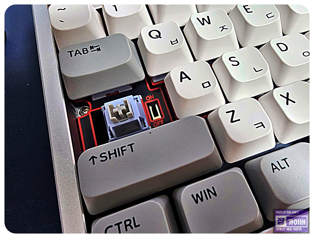 - 전원 ON/OFF 방식: CAPSLOCK 키캡을 열어야만 전원 스위치를 조작할 수 있어 직관적이지 못한 부분이 있습니다. 자주 사용하는 기능이 아닌 만큼 큰 불편함은 아니지만, 조금 더 접근성이 좋았으면 하는 아쉬움이 남습니다.
