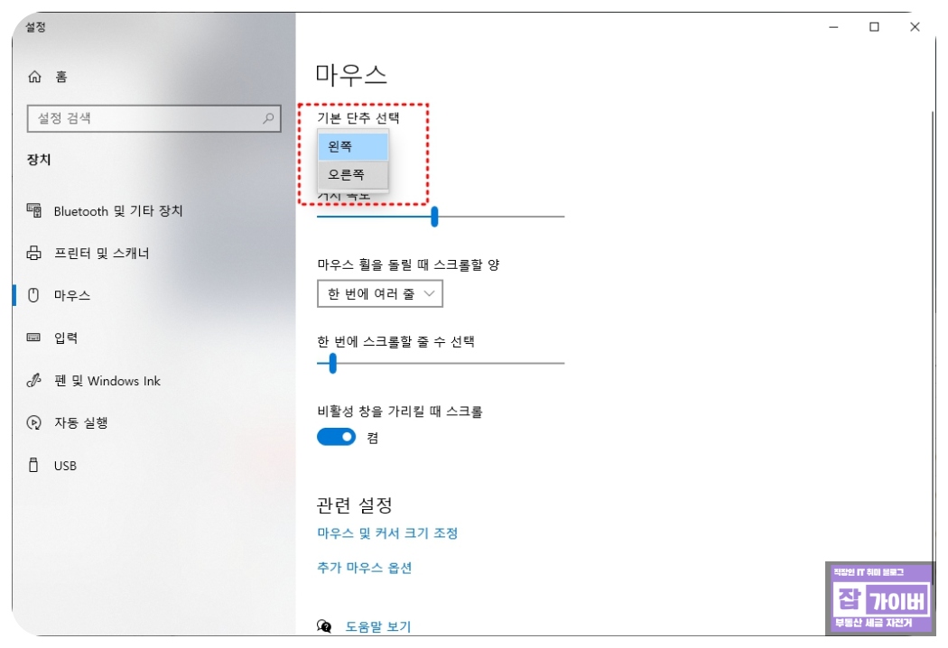 이 간단한 설정으로 이제 마우스의 버튼 기능이 반대로 설정하면 됩니다.