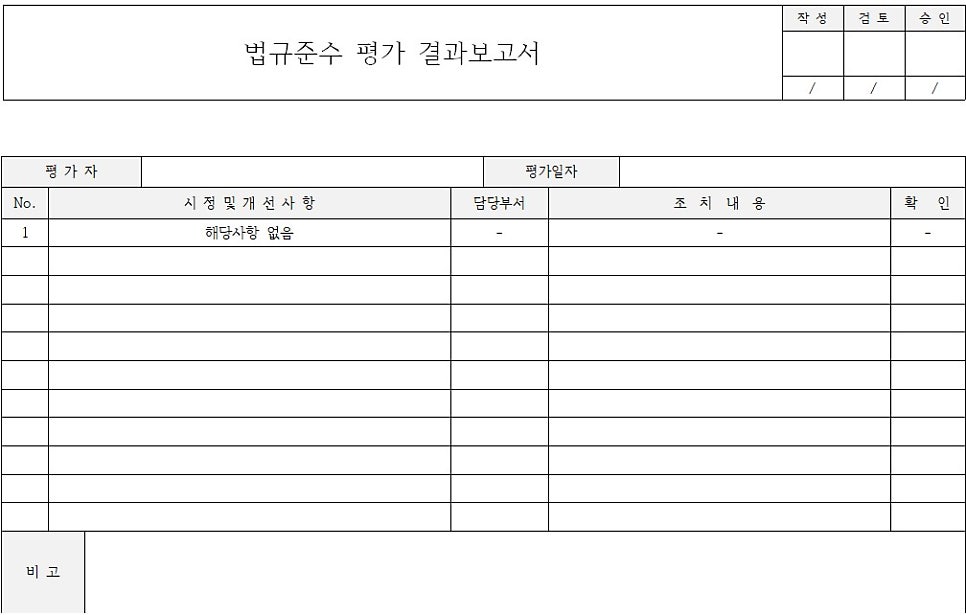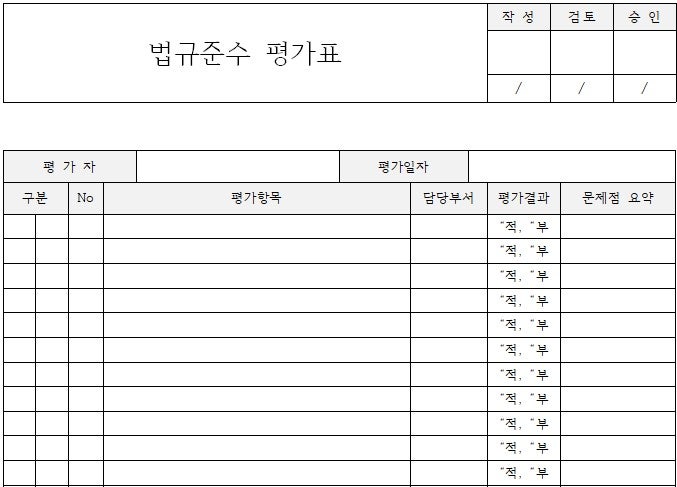 안전보건경영 시스템 법규관리대장, 법규준수평가 양식 /ISO45001