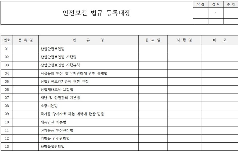 5.3 등록이 필요한 법규 및 요구사항은 ‘안전보건 법규 등록부’ 양식에 등록되며, 등록된 내용은 주관 부서장의 검토를 거쳐 최고경영자의 승인을 받아야 합니다. 이를 통해 법적 준수 책임을 명확히 할 수 있습니다.