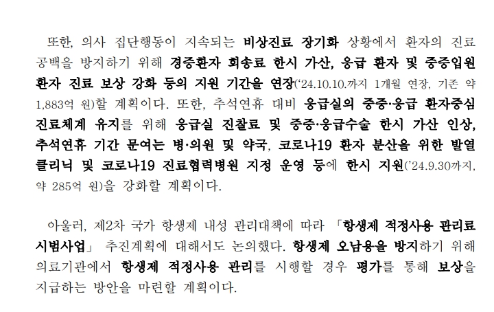 정부는 응급 및 중증 환자, 야간·휴일 진료, 소아·분만, 의료 취약지 등에 필요한 건강보험 지출을 유지하며, 필수 분야에 대한 투자를 지속하고 있습니다. 이는 국민들이 안정적으로 의료 서비스를 받을 수 있도록 보장하면서, 건강보험 재정을 효율적으로 관리하려는 목적입니다.