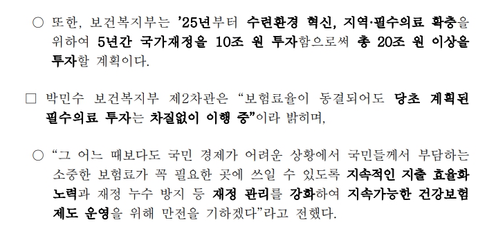 2025년 건강보험요율 동결에도 불구하고 필수 의료 분야에 대한 투자 계획은 차질 없이 진행될 예정입니다.