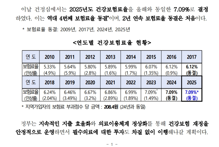 지난 9월 보건복지부는 건강보험정책심의위원회를 통해 2025년 건강보험요율을 작년과 동일하게 7.09%로 유지하기로 결정했습니다.