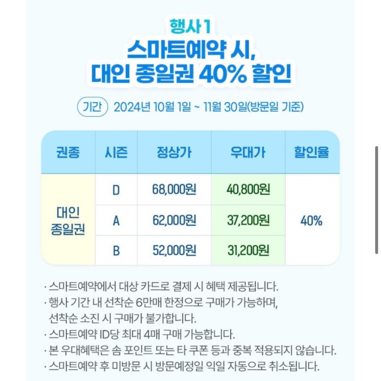 - 카드 종류에 따라 할인율 상이, 예를 들어 KB국민 에버랜드 판다카드 50% 할인