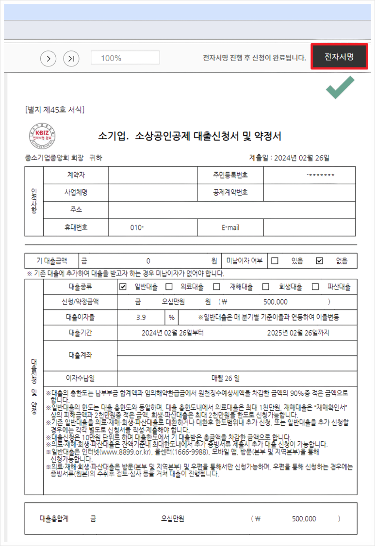 소기업 소상공인공제 대출신청서 및 약정서 양식