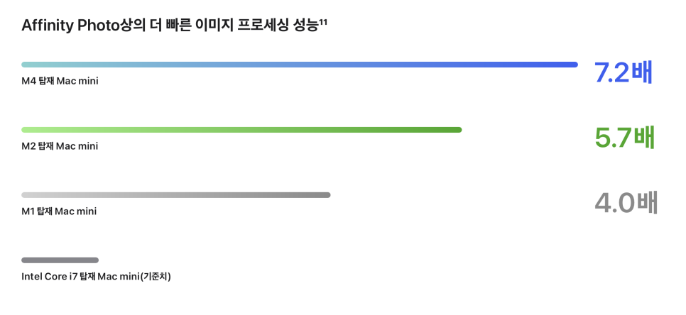 | M4 칩 | 1.8배 향상 | 2.2배 향상 | 3배 더 빠름 |