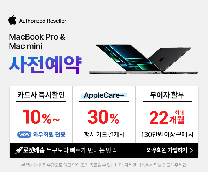 고가의 맥 미니이므로 파워서플라이 고장, 메인보드 문제 발생 시 수리비가 높습니다. 장기 사용 계획이라면 애플 케어플러스 가입을 추천드립니다.
