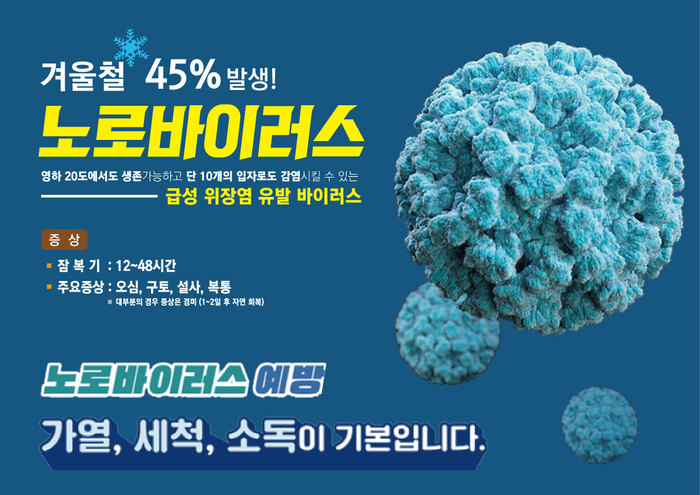 노로바이러스 감염은 위와 장에 염증을 일으키는 바이러스성 급성 위장염을 말한다. 겨울철처럼 기온이 낮은 시기에 특히 잘 퍼지며, 극소량의 바이러스만으로도 감염이 가능해서 한 번 유행이 시작되면 주변 사람들에게 빠르게 번지기 쉽다. 조금만 방심해도 가족 단위로 감염되는 경우가 많기 때문에 계절이 바뀔 때 특히 더 신경을 써 줄 필요가 있다.