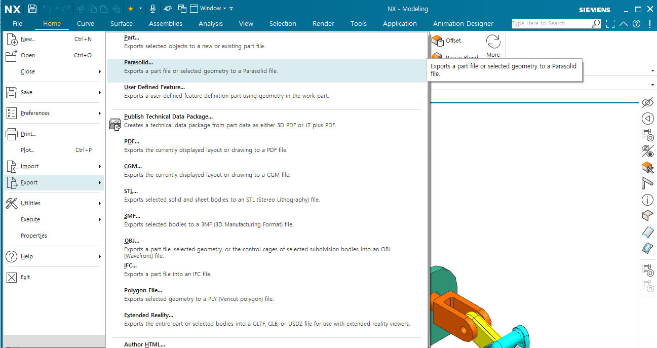우선 "File -> Export -> Part" 명령을 사용합니다.