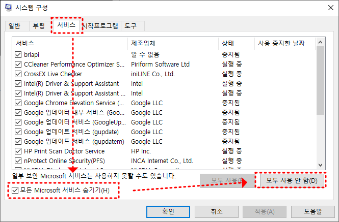 백그라운드 프로그램이 충돌을 일으키는 경우 클린 부팅으로 불필요한 서비스들을 차단하면 문제를 찾기 쉽다.