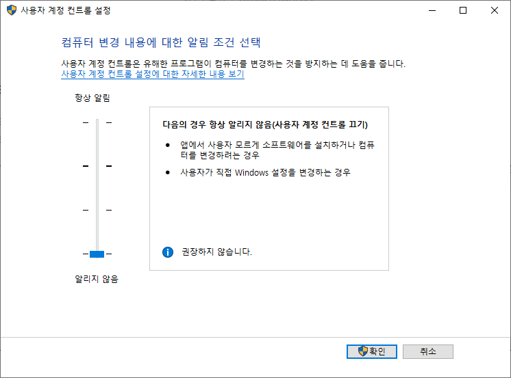 • UAC 설정이 너무 높아 실행 자체가 차단되는 경우