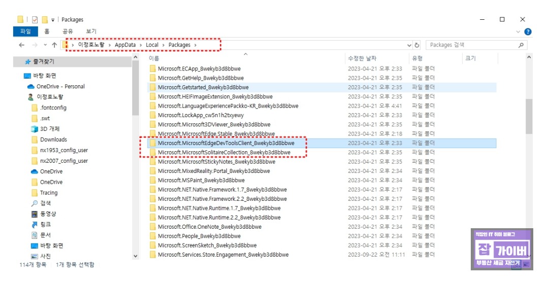 여기서 AppData 폴더가 보이지 않는 경우, 폴더 옵션에서 '숨김 항목'을 체크하여 숨겨진 폴더를 표시해야 합니다.C:\Users\[PC이름]\AppData\Local\Packages