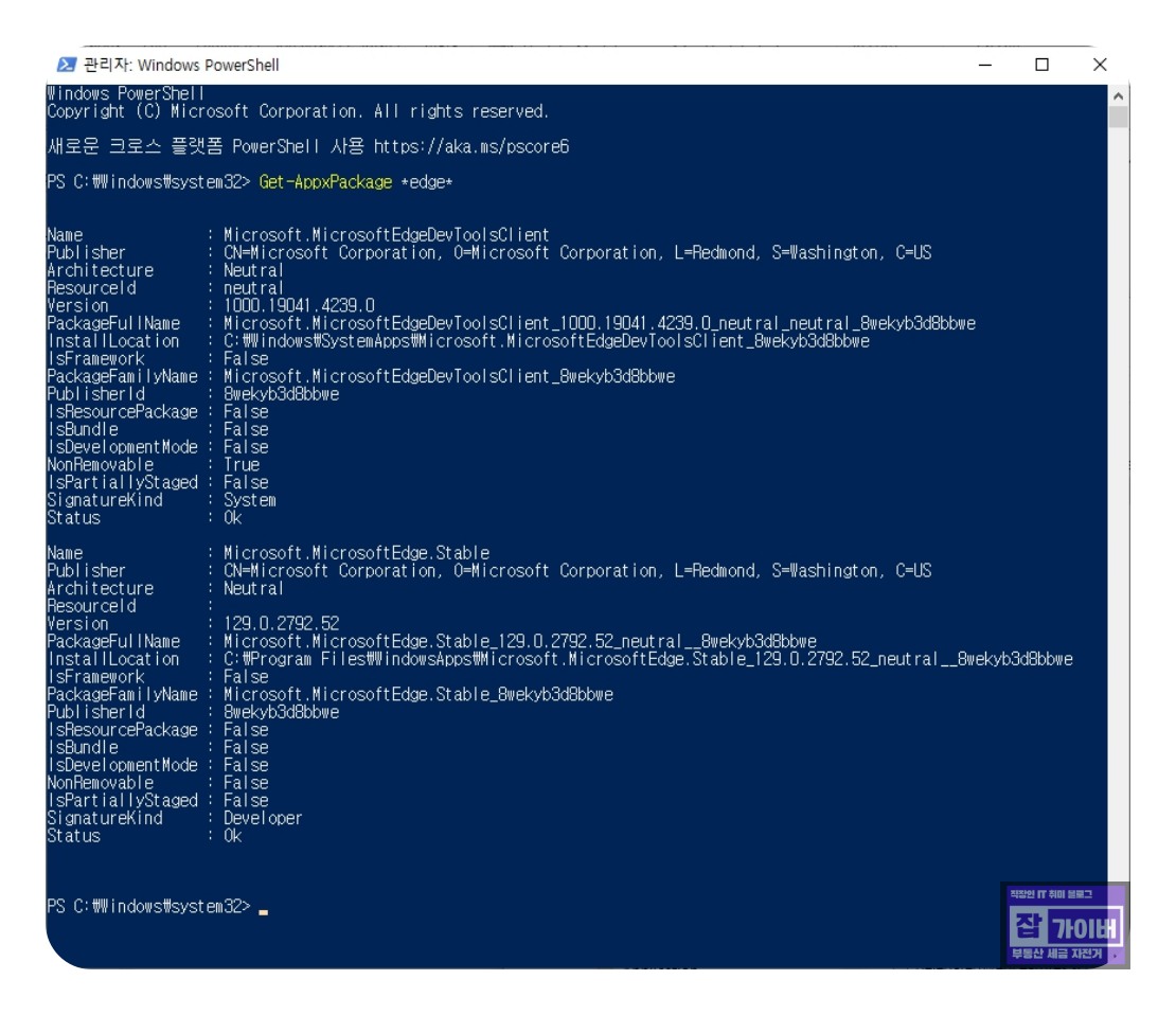 - 다음 명령어를 입력하여 엣지 관련 패키지를 조회: Get-AppxPackage *edge*