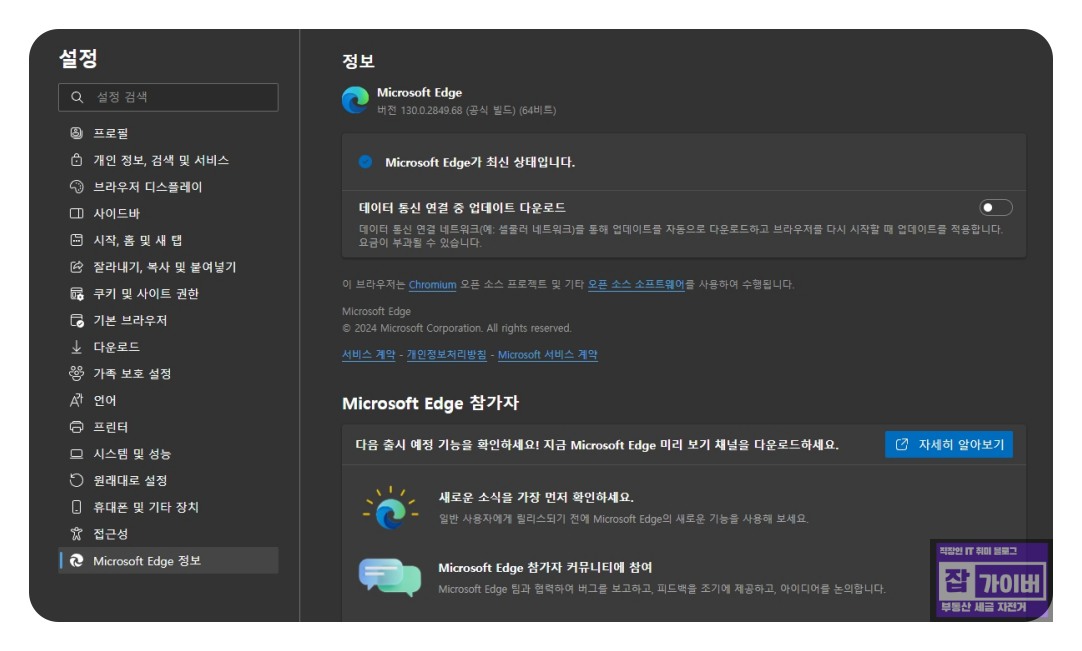 - '도움말 및 피드백' > 'Microsoft Edge 정보'를 선택하여 현재 버전을 확인합니다.