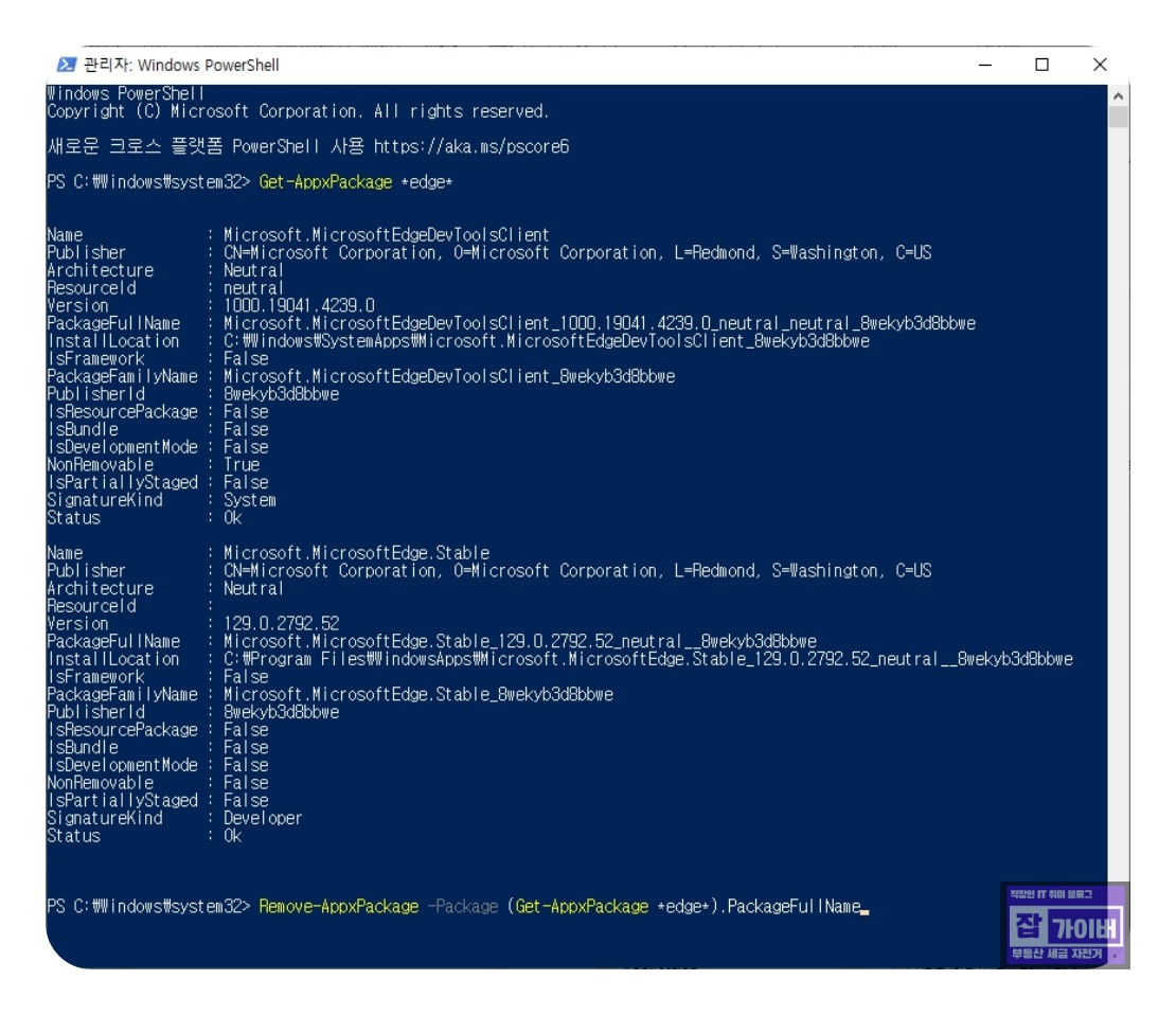 - 조회된 패키지를 제거: Remove-AppxPackage -Package (Get-AppxPackage *edge*).PackageFullName