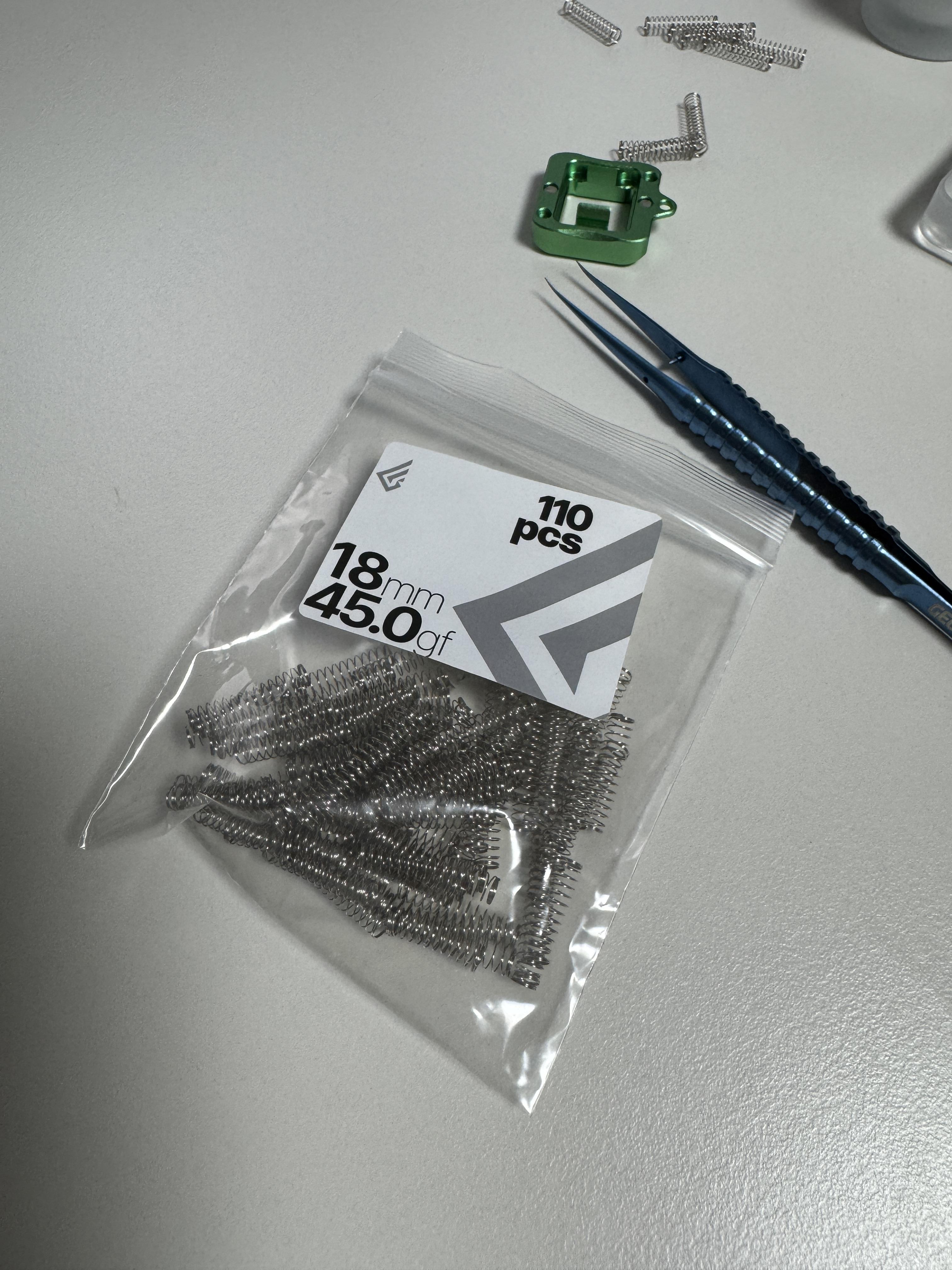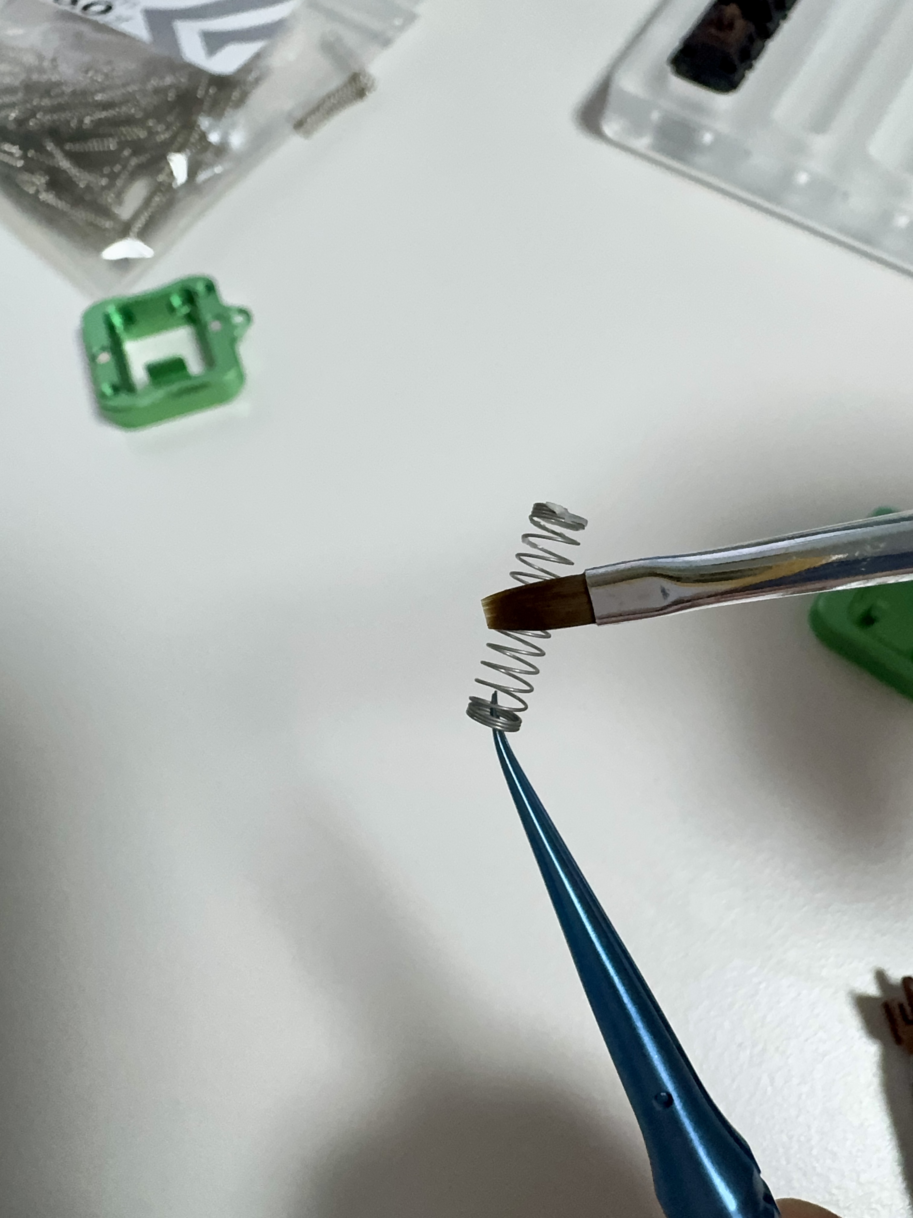 스프링을 작은 봉투에 넣고 크라이톡스 105를 몇 방울 떨어뜨린 후 흔들어 고르게 윤활합니다. 스프링에 직접 붓으로 바르면 작업이 까다롭기 때문에, 봉지 윤활이 더 편하고 효율적입니다. 이후, 혹시 뭉친 부분이 보이면 붓으로 살짝 펴줍니다.