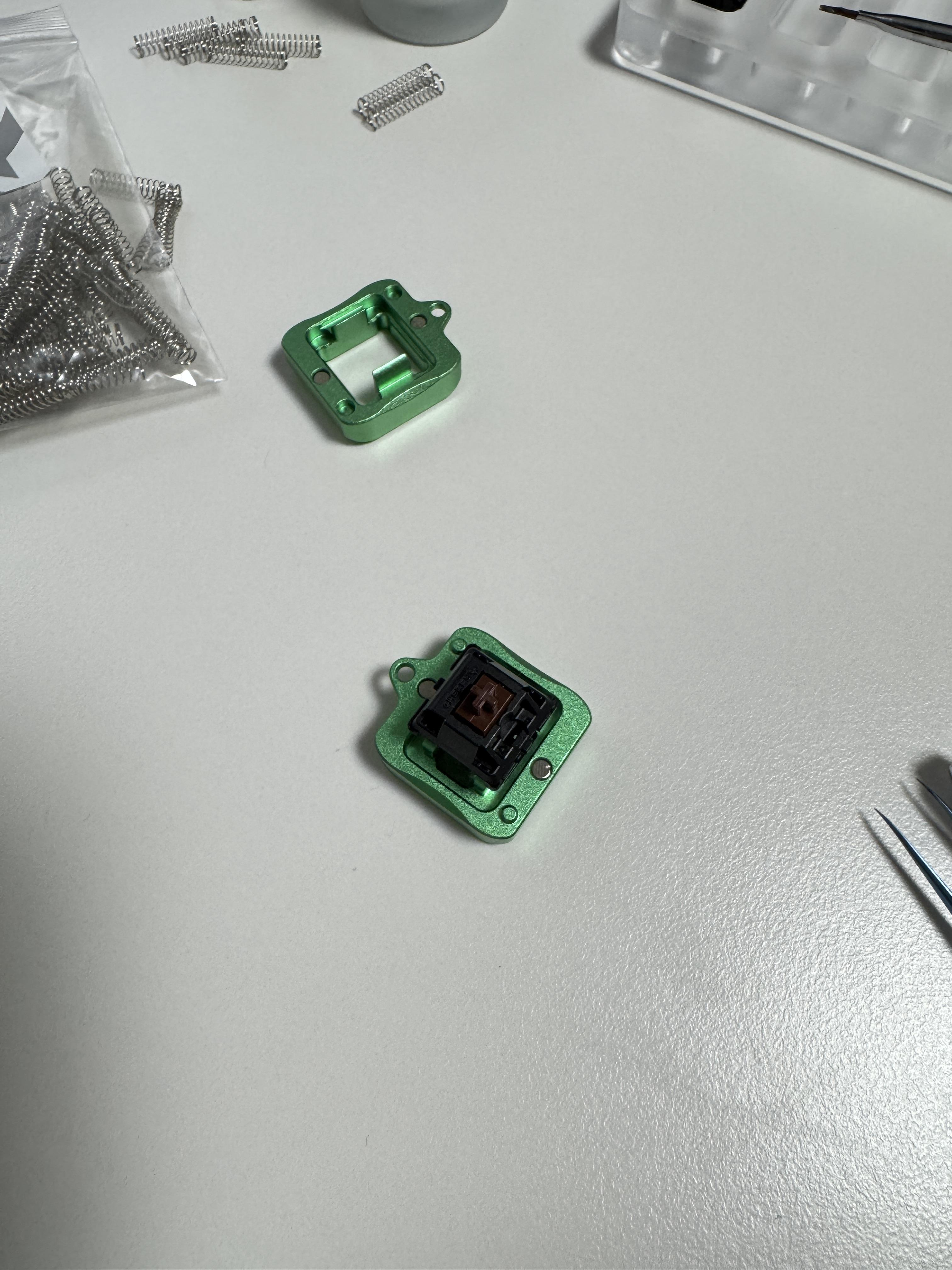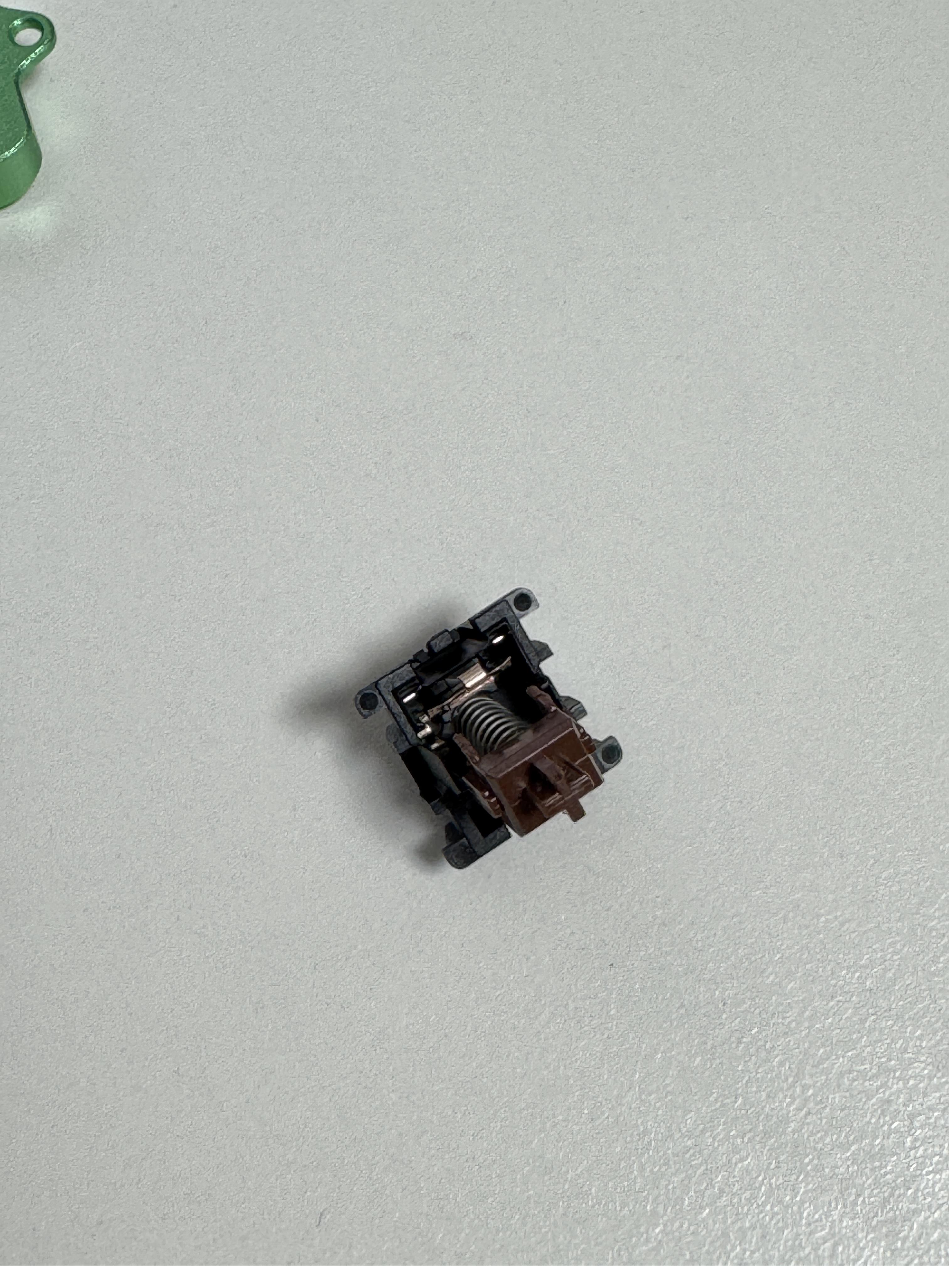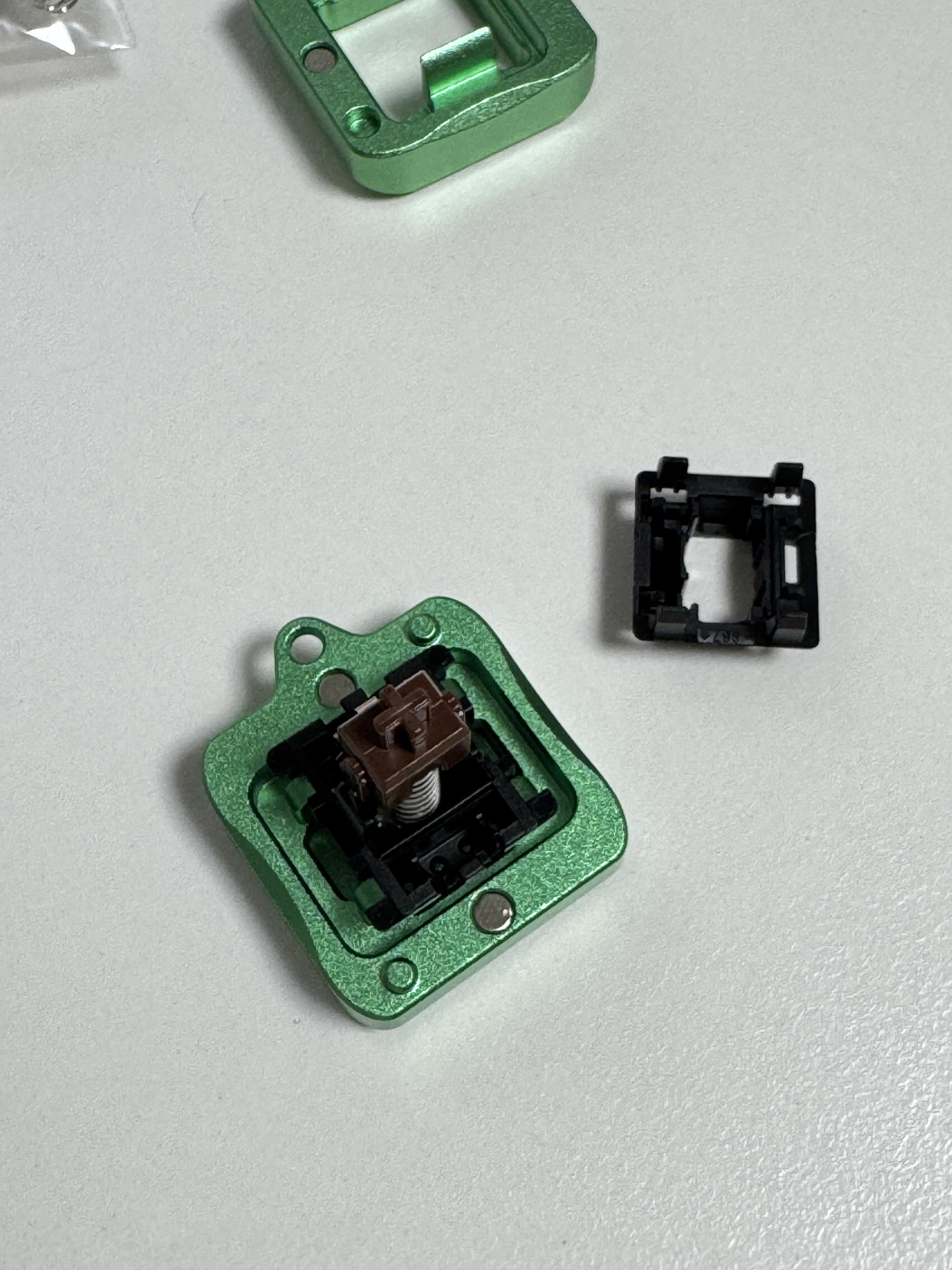 그러면 스위치가 네 가지 주요 구성품으로 나뉩니다: 하부 하우징, 스프링, 슬라이더, 상부 하우징. 윤활은 하부 하우징부터 시작하는 것이 효율적입니다.