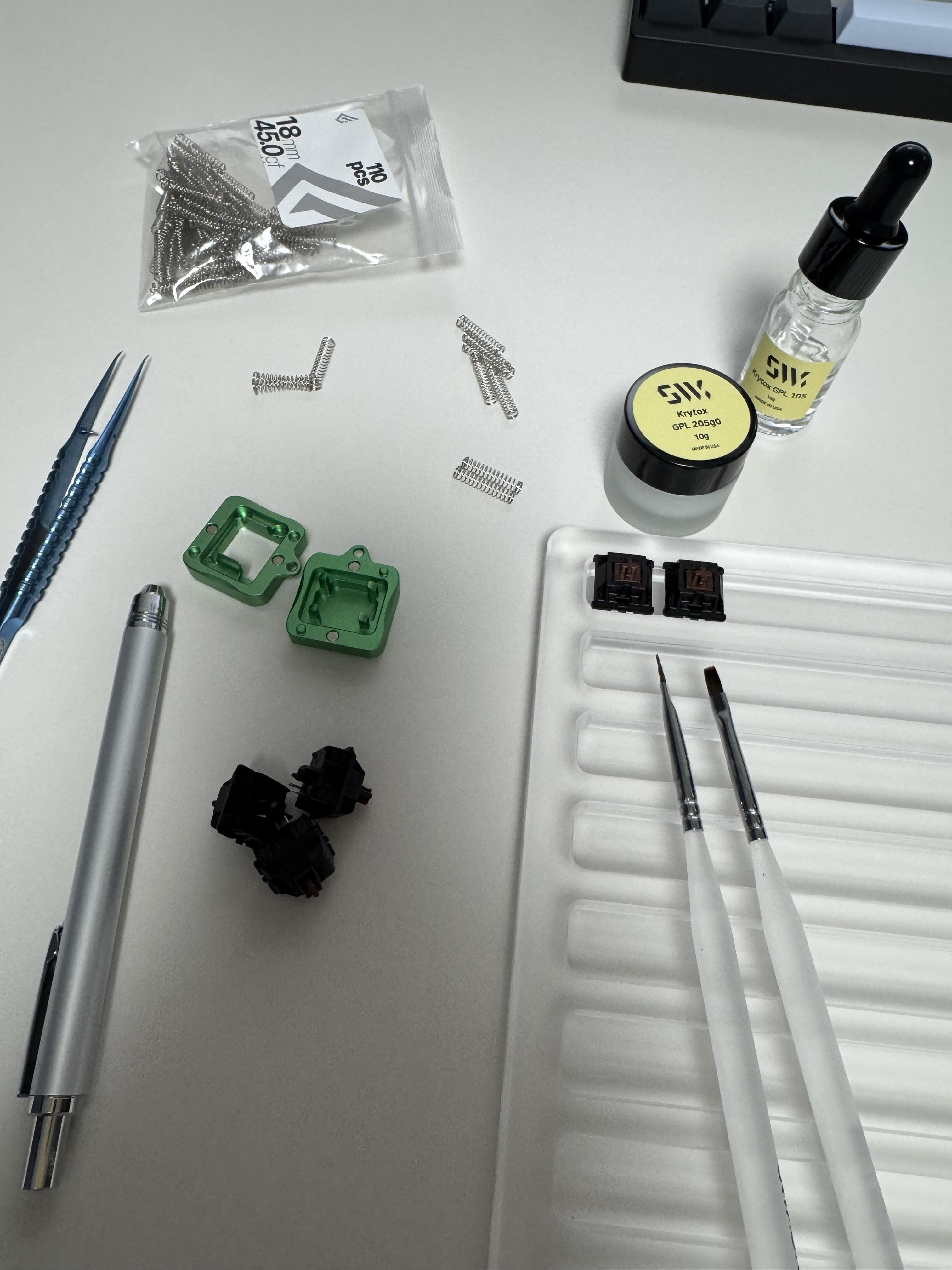 윤활제를 바를 때는 크라이톡스 205을 주로 사용하며, 이 윤활제는 키보드 타건감을 묵직하고 부드럽게 만들어주는 특징이 있습니다. 스프링에는 크라이톡스 105를 사용해 잡음을 줄이고 스프링의 떨림을 방지합니다.