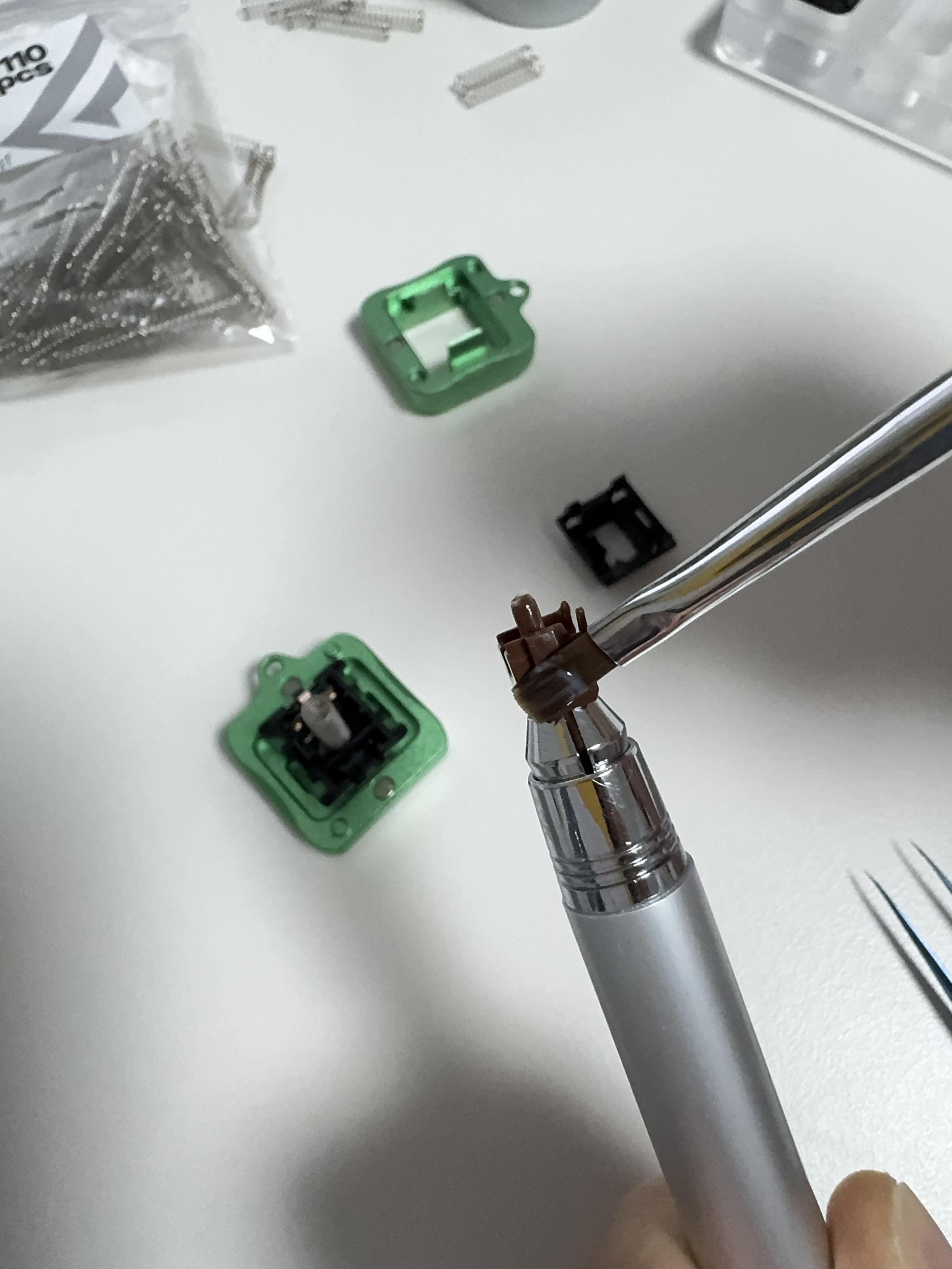 하부 하우징을 윤활 스테이션에 고정하고, 크라이톡스 205을 붓에 아주 소량 묻혀서 윤활할 부위에 고르게 발라줍니다. 뭉치지 않게 넓게 펴 발라야 타건감이 부드럽게 느껴집니다.