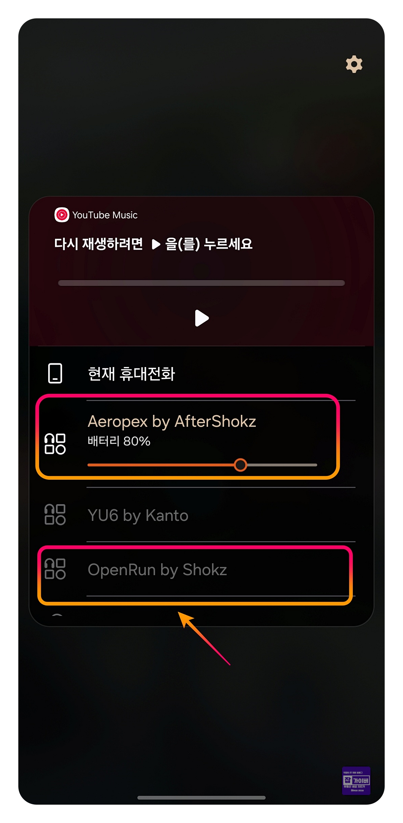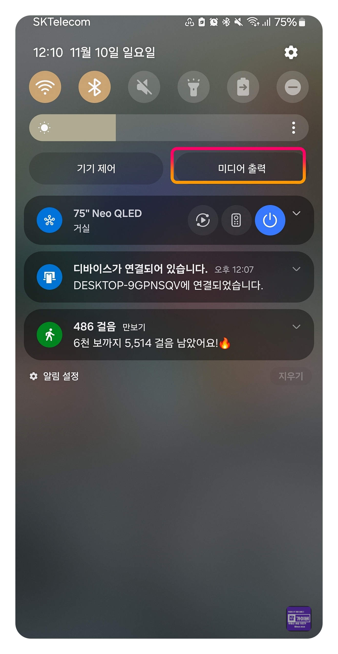 미디어 출력 아이콘을 선택하여 현재 연결된 블루투스 기기 목록을 확인합니다.