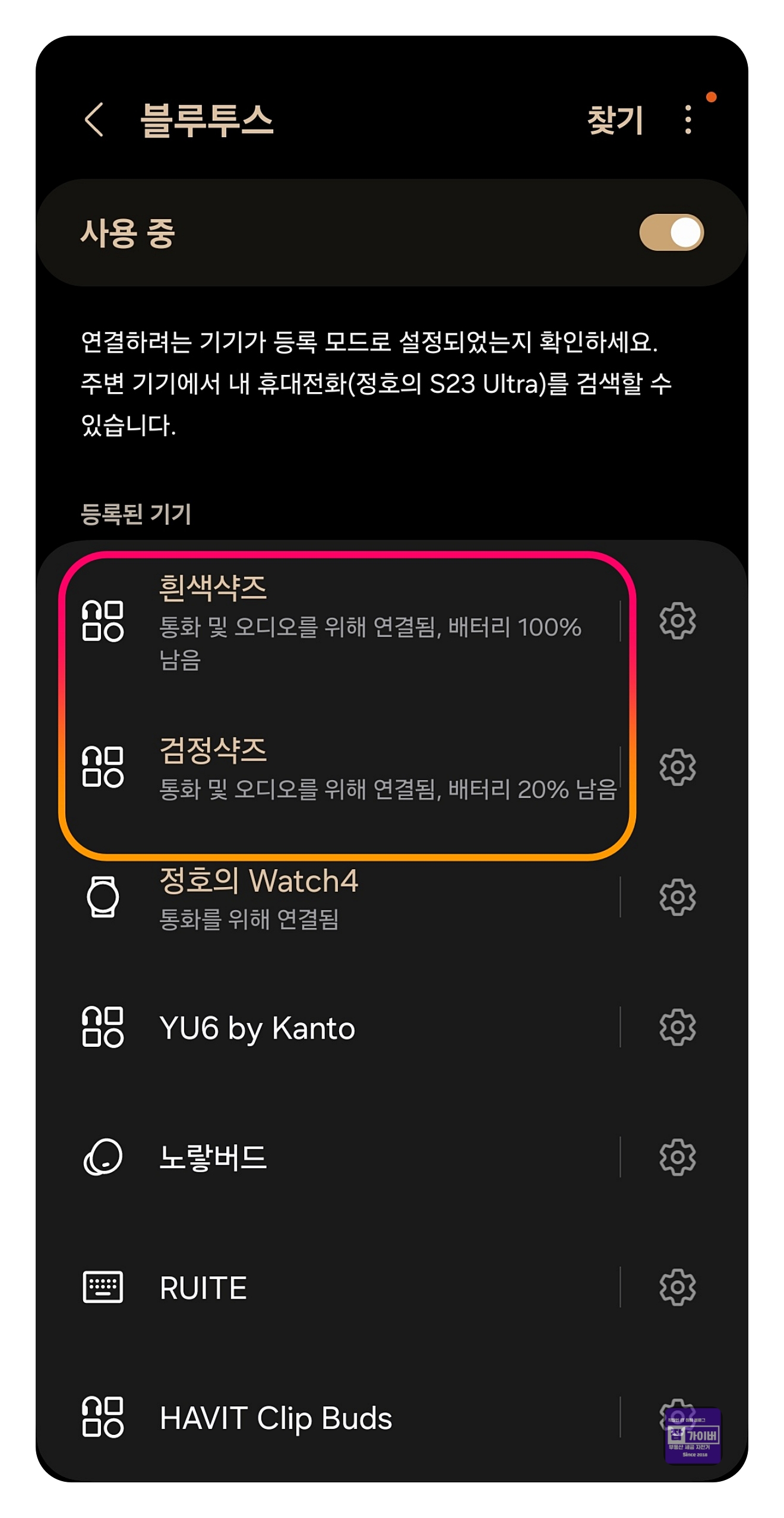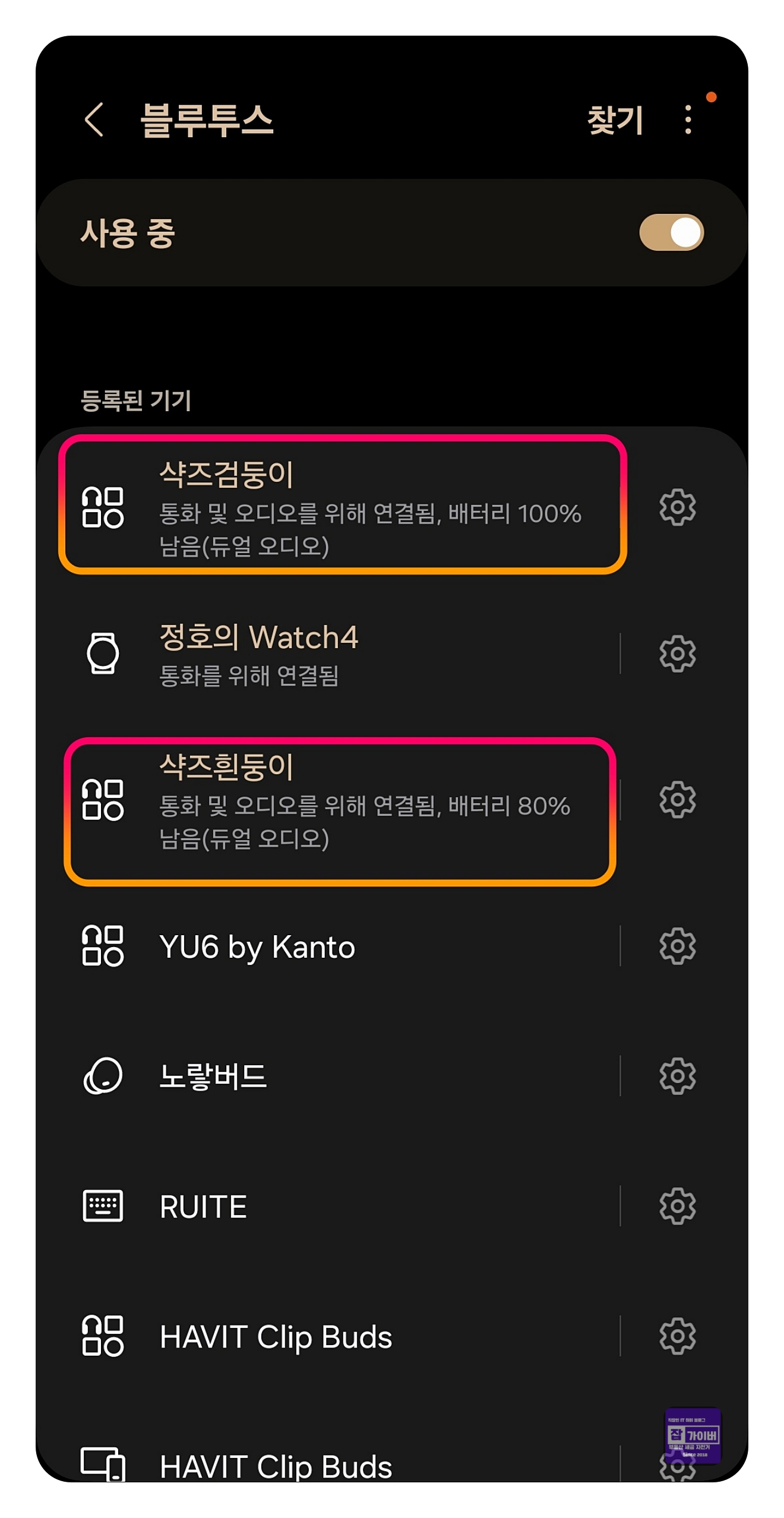 두 번째 블루투스 기기도 동일한 방법으로 페어링하여 연결합니다.