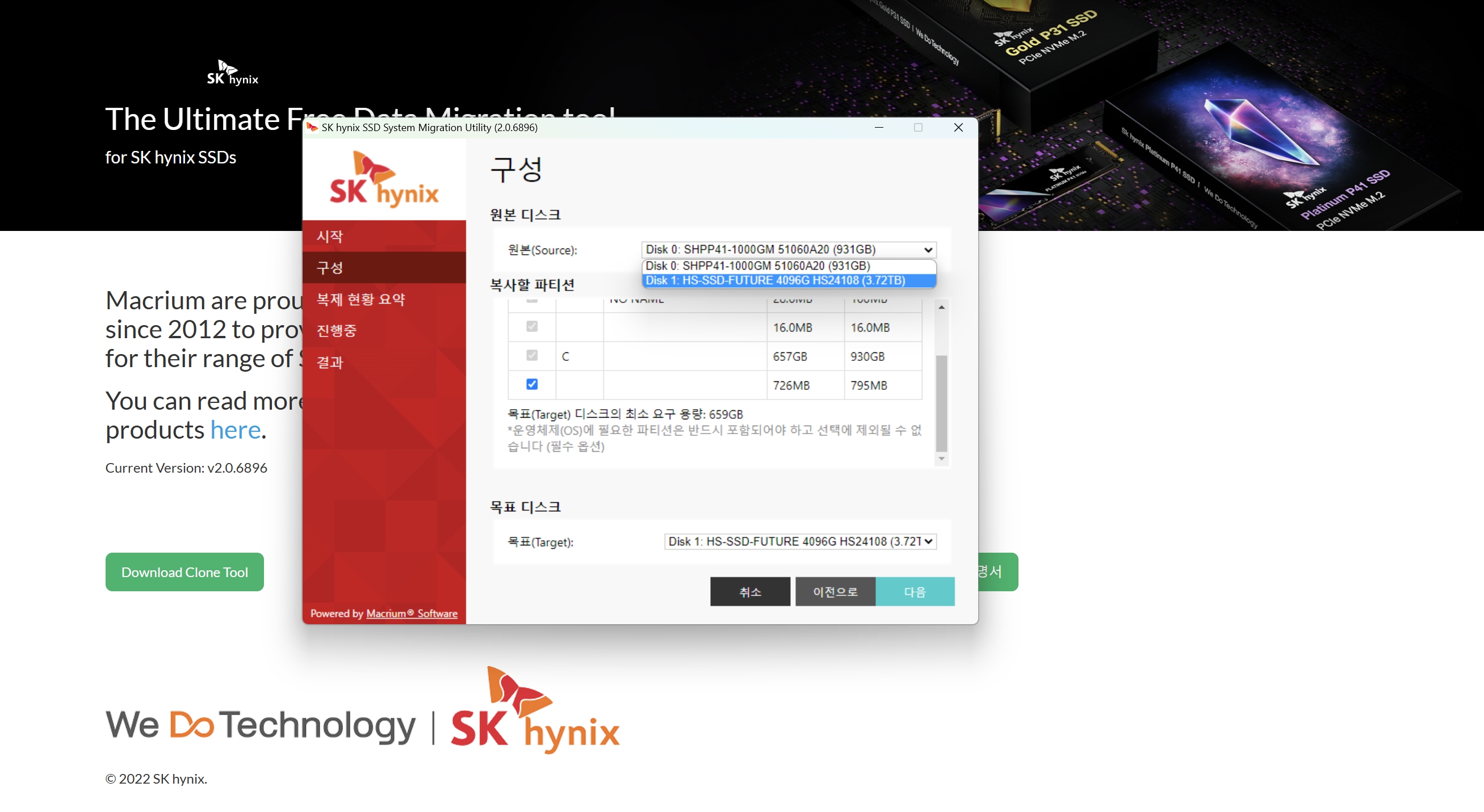 별도의 SK하이닉스 마이그레이션 툴을 사용하지 않더라도 아래 제공되는 다양한 마이그레이션 프로그램을 사용해 윈도우가 설치된 환경을 그대로 새로운 SSD로 복제하여 이동하느것이 가능합니다.