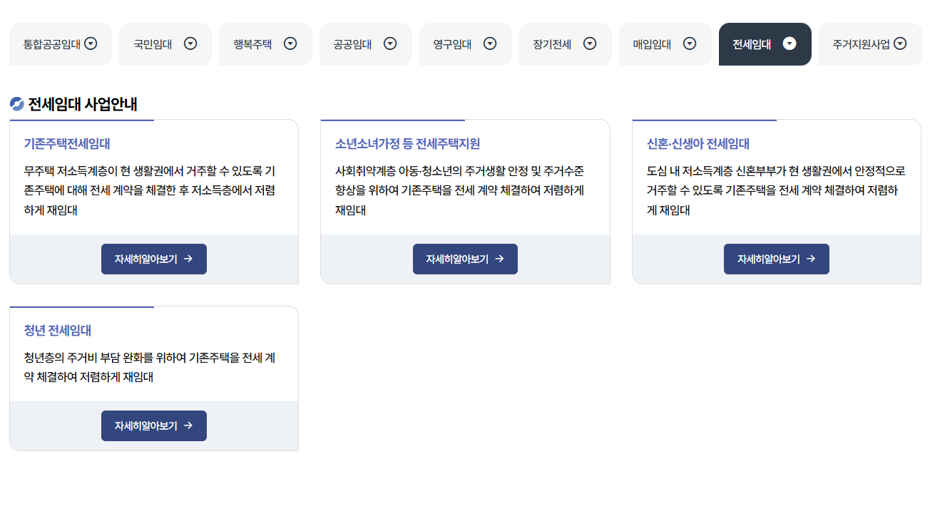 | 전세임대주택 | 입주자가 원하는 주택을 선택. LH가 전세 계약 후 재임대 | 기초생활수급자, 한부모가족, 장애인 등. 무주택 세대구성원, 재산 기준 2억 9천2백만 원 이하 |