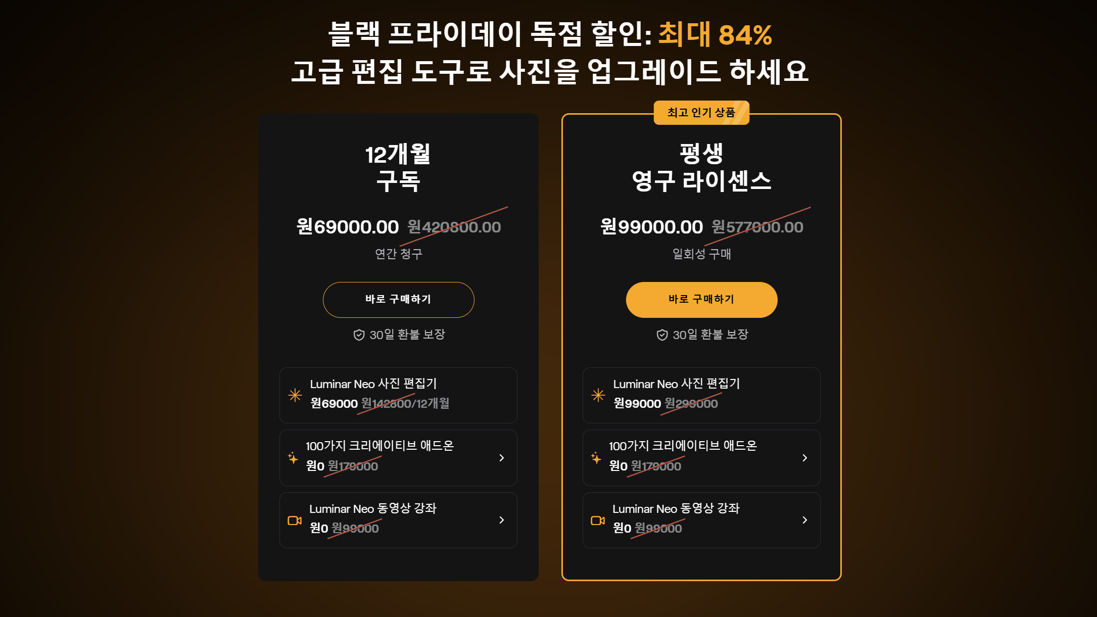 이번 블랙프라이데이 할인 혜택은 한정된 기간 동안만 제공됩니다. 루미나르를 통해 사진 편집의 새로운 가능성을 경험하세요!