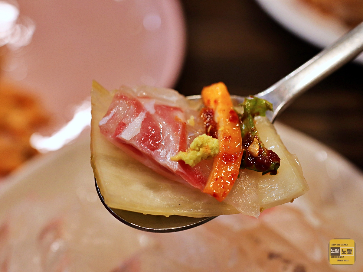 이번에 나온 회는 도미, 줄돔, 광어, 농어로 구성되어 있었는데, 각기 다른 생선들이 두툼하게 썰려서 신선도가 그대로 느껴졌습니다. 첫 번째 한 점은 고추냉이 간장에 찍어 먹었는데요,