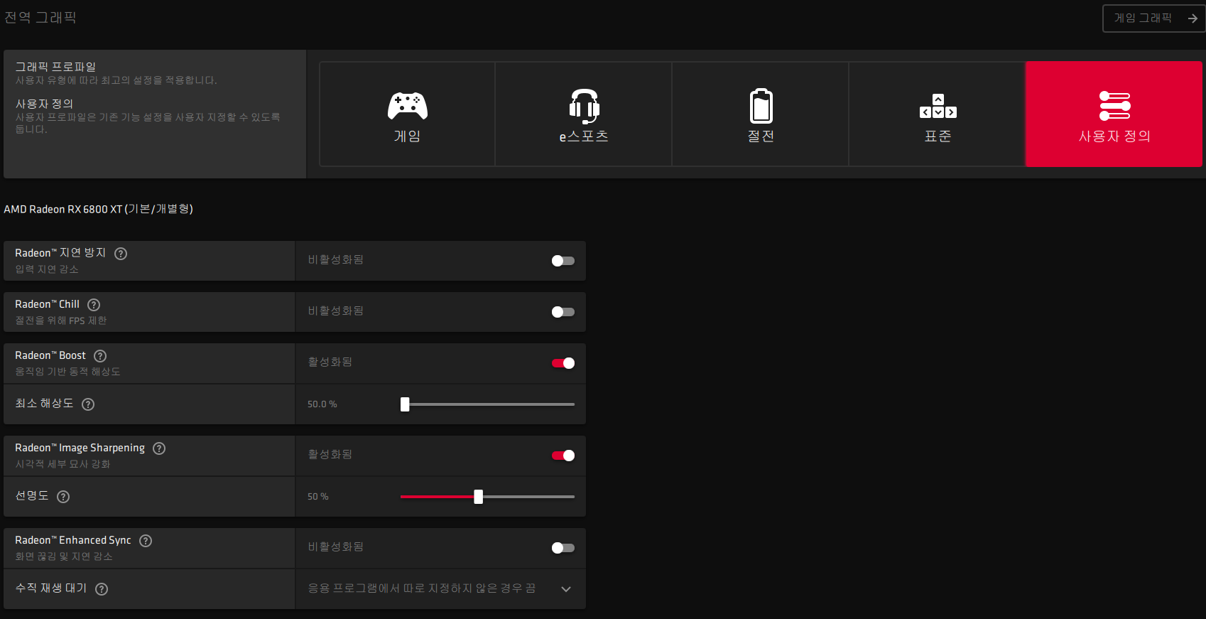 아드레날린에서 '게임 > 개별 타이틀 선택 > 그래픽 설정 사용자 정의'를 통해 각 게임에 맞는 프레임 제한, Anti-Lag, Chill 조합을 별도로 설정할 수 있습니다.