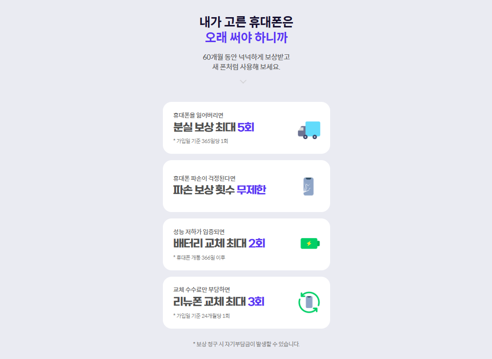 | 리뉴폰 교체 서비스 | 2년에 1회, 최대 3회 (가입 시점 휴대폰 출고가의 11% 또는 13% 교체 수수료 발생) | 제공하지 않음 |