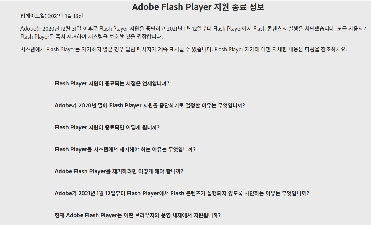 2021년 1월부터 Adobe Flash Player의 지원이 전면 종료되었습니다. 이로 인해 플래시 기반의 콘텐츠를 더 이상 기본 브라우저나 운영체제에서 실행할 수 없게 되었습니다.