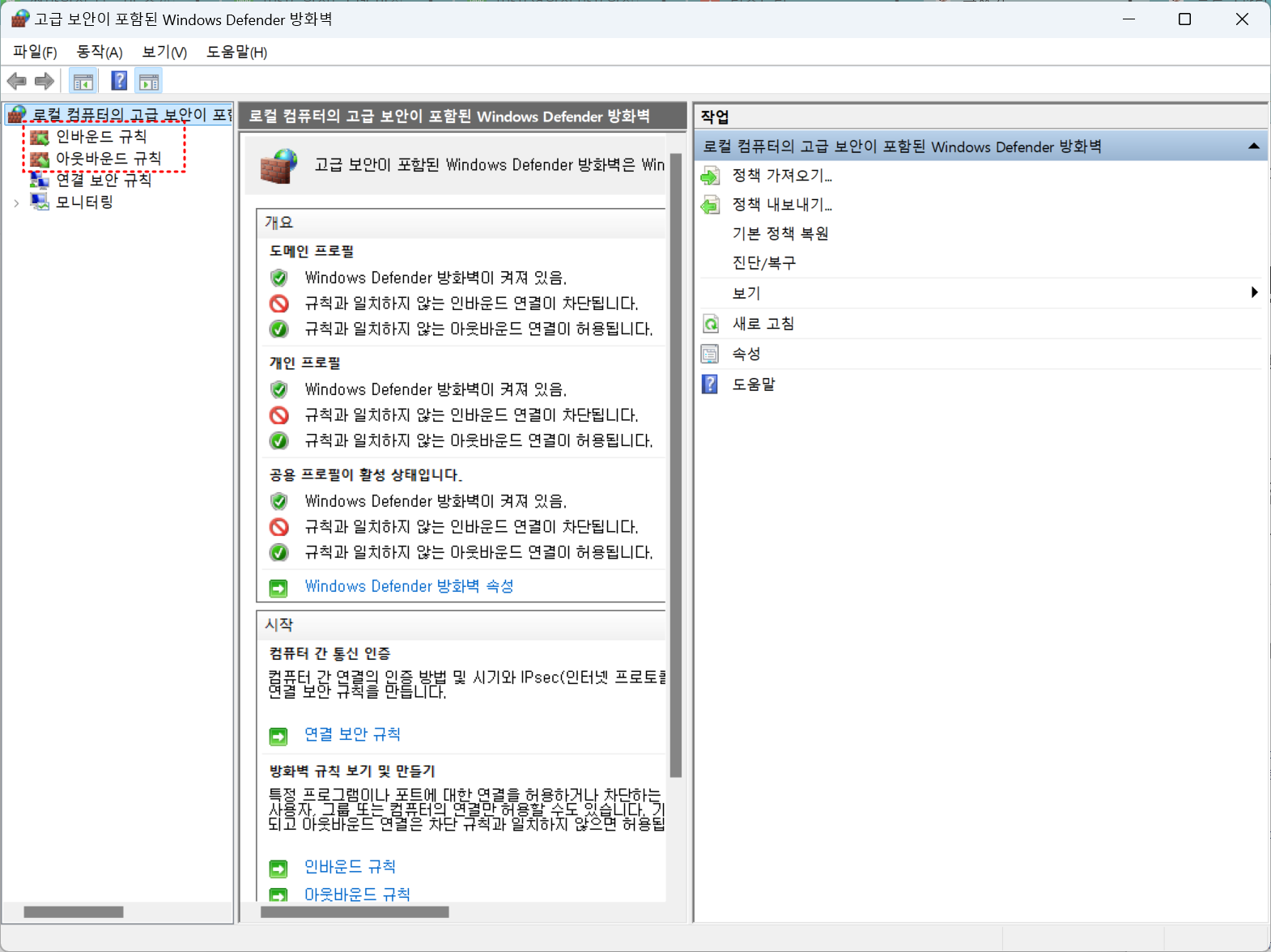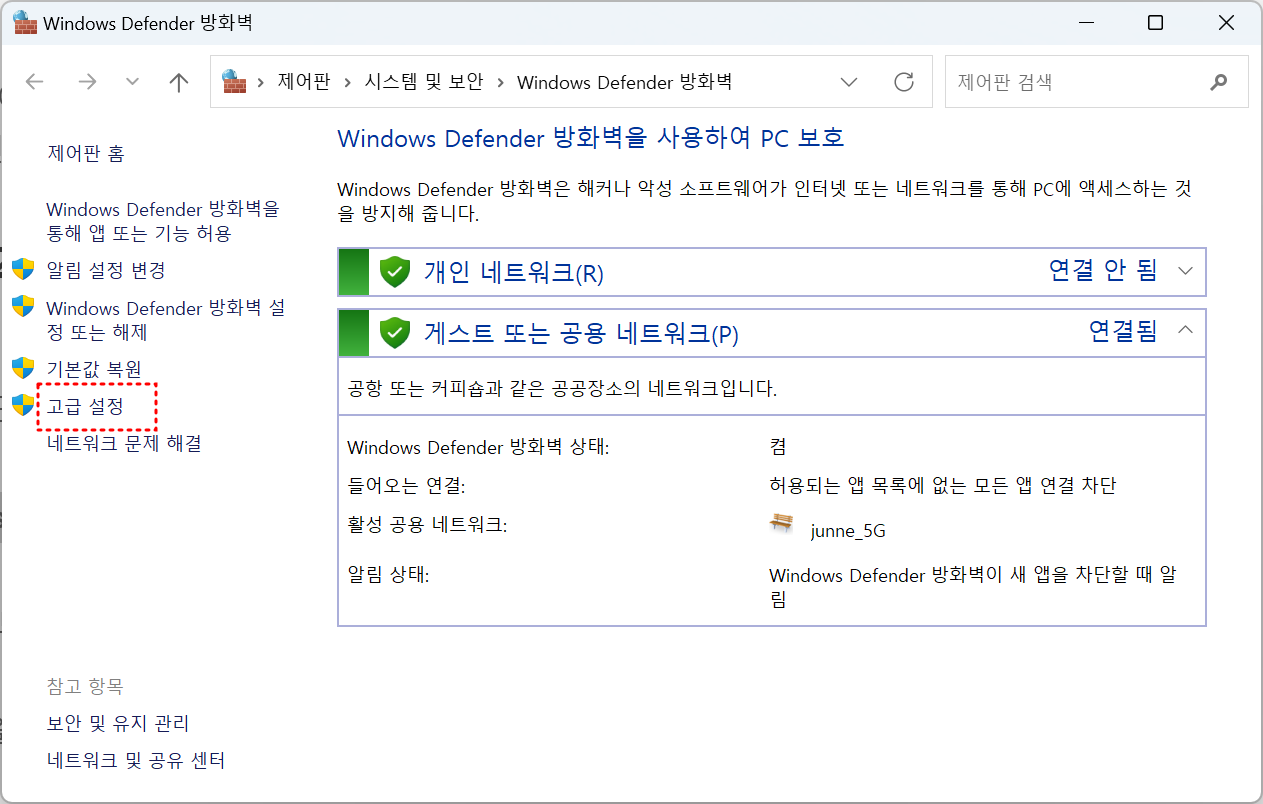 먼저, 제어판에서 Windows Defender 방화벽을 찾고 "고급 설정"을 엽니다.