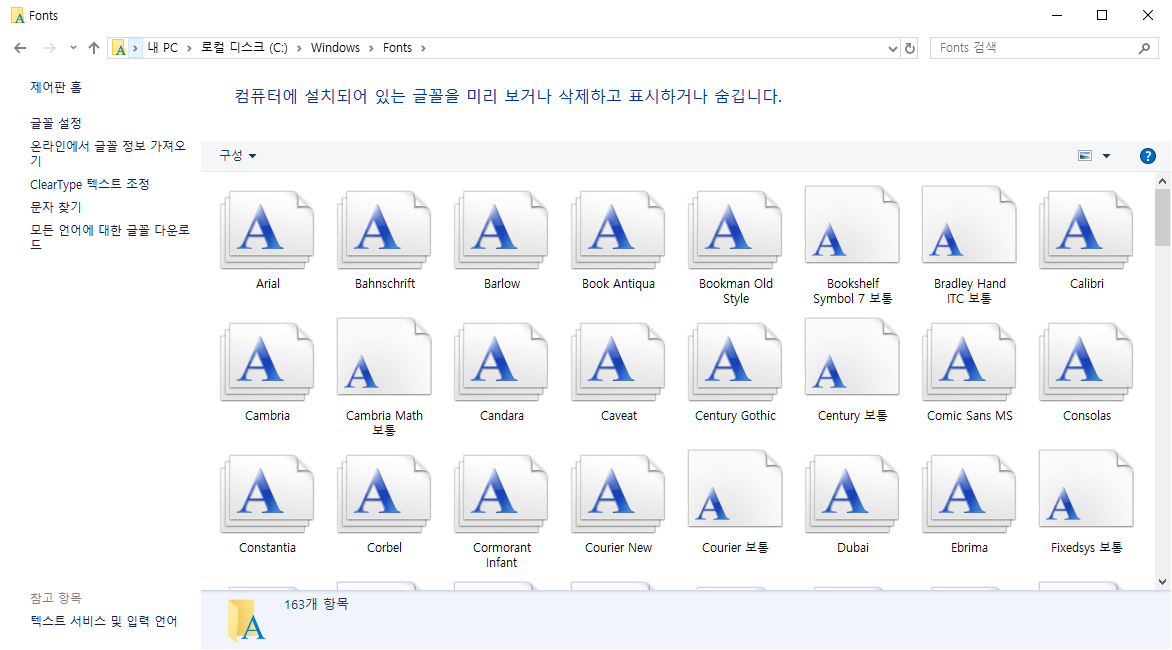 - C:\Windows\Fonts 경로로 이동하여 폰트를 확인합니다.